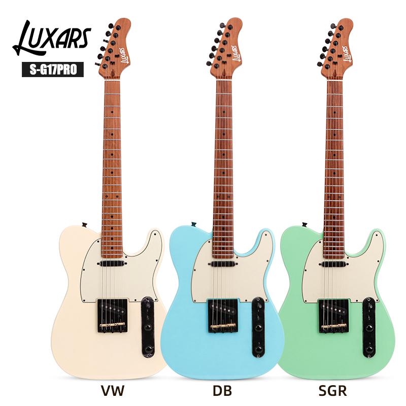 升級版 TELE 電吉他 型號:S-G17-PRO 琴身:白楊木 琴頸:緞面烤楓木 指板:緞面烤楓木 品位:22,圓頭品位 弦長:648 毫米,25.5 英寸 結構:螺栓固定 控制方式:1V1T,三向切換 琴橋系統:硬尾 硬體:黑色 拾音器:S-S,Alnico V 漆面:高光