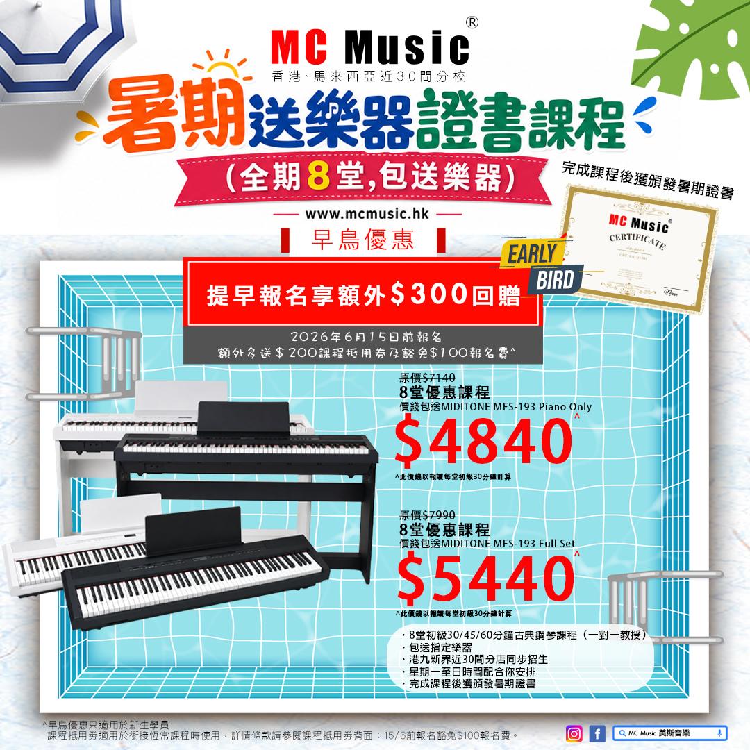 暑期鋼琴證書課程 (全期8堂,包送 MIDITONE MFS-193 Full Set ⿊/⽩)